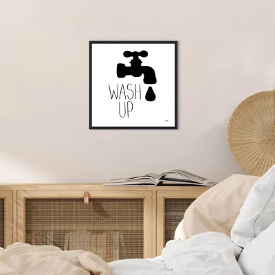 ART DESCRIPTION: The bold statement of this print cant be missed. A vintage faucet with an ominous drop of water falling from it is completed by these two words: wash up. Its especially appropriate for naughty children who need a push toward good hygiene. This Amanti Art canvas art print was created by Leah York and printed by Amanti Art in Madison WI. The canvas is stretched by hand and finished with a float frame. Individually made using traditional custom framing techniques, it has the quality you would expect from your local frame shop. Because of our attention to detail and focus on artistry, architects, interior designers, and homeowners alike choose this framed canvas artwork to create beautiful living spaces.