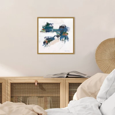 ART DESCRIPTION: Waves of paint lap over formless elements of what may be sands, seashores, red blossoms and distant islands or even whole worlds, but then scratch up to return to a puzzling mixture of shapes and colors blurred on a white canvas. This Amanti Art canvas art print was created by Suzanne McCourt and printed by Amanti Art in Madison WI. The canvas is stretched by hand and finished with a float frame. Individually made using traditional custom framing techniques, it has the quality you would expect from your local frame shop. Because of our attention to detail and focus on artistry, architects, interior designers, and homeowners alike choose this framed canvas artwork to create beautiful living spaces.