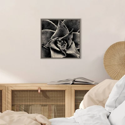 ART DESCRIPTION: Dusty leaves spiral throughout the center of this black an white photo, reaching for the sun. Although a succulent, this little plant is just a little curled up on the edge, a note of distress giving extra sentiment to the monochromatic spikes. This Amanti Art canvas art print was created by Gary Horsfall and printed by Amanti Art in Madison WI. The canvas is stretched by hand and finished with a float frame. Individually made using traditional custom framing techniques, it has the quality you would expect from your local frame shop. Because of our attention to detail and focus on artistry, architects, interior designers, and homeowners alike choose this framed canvas artwork to create beautiful living spaces.