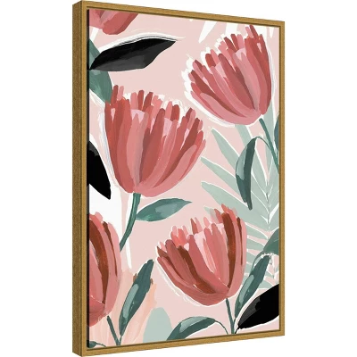 ART DESCRIPTION: Three large variegated salmon colored tulip-like flowers burst forth with sage and fir green leaves over a pastel pink background in this summery floral image. This Amanti Art canvas art print was created by Isabelle Z and printed by Amanti Art in Madison WI. The canvas is stretched by hand and finished with a float frame. Individually made using traditional custom framing techniques, it has the quality you would expect from your local frame shop. Because of our attention to detail and focus on artistry, architects, interior designers, and homeowners alike choose this framed canvas artwork to create beautiful living spaces.