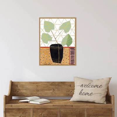 ART DESCRIPTION: A stylistic still life makes for an interesting composition in this unique print. The gold patterned tablecloth sits under a black planter, which holds a single stem with green leaves. The geometric pattern on the wall adds texture to the image. This Amanti Art canvas art print was created by Marisa Anon and printed by Amanti Art in Madison WI. The canvas is stretched by hand and finished with a float frame. Individually made using traditional custom framing techniques, it has the quality you would expect from your local frame shop. Because of our attention to detail and focus on artistry, architects, interior designers, and homeowners alike choose this framed canvas artwork to create beautiful living spaces.