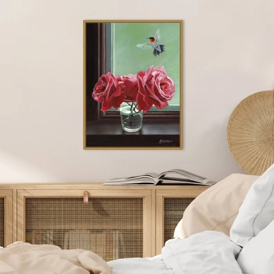 ART DESCRIPTION: A bird hovers near a small jar of beautiful, red roses that sit on the windowsill. Separated by a pane of glass, all the bird can do is dream about how wonderful they smell and admire their beauty. This Amanti Art canvas art print was created by Fred Szatkowski and printed by Amanti Art in Madison WI. The canvas is stretched by hand and finished with a float frame. Individually made using traditional custom framing techniques, it has the quality you would expect from your local frame shop. Because of our attention to detail and focus on artistry, architects, interior designers, and homeowners alike choose this framed canvas artwork to create beautiful living spaces.