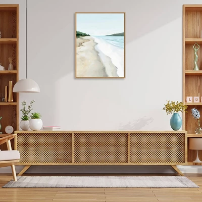 ART DESCRIPTION: Gentle waves lap at the sandy shore in this watercolor painting. These waves are the focus of the picture and are painted in pale blue and white, while the beach is depicted in neutrals of cream, beige, and gray. This Amanti Art canvas art print was created by Isabelle Z and printed by Amanti Art in Madison WI. The canvas is stretched by hand and finished with a float frame. Individually made using traditional custom framing techniques, it has the quality you would expect from your local frame shop. Because of our attention to detail and focus on artistry, architects, interior designers, and homeowners alike choose this framed canvas artwork to create beautiful living spaces.