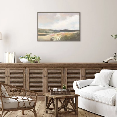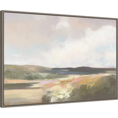 - FRAME DETAILS: The canvas is framed in the Sylvie Greywash frame, which is a modern, float frame with greywash woodgrain coloring and dramatic depth. The frame measures 1 in. wide and stands 2 in. off the wall. The canvas appears as if it is floating in the frame because it has a narrow gap between the edge of the canvas and the frame. The overall size of this framed canvas print measures 33 in. W x 23 in. H.